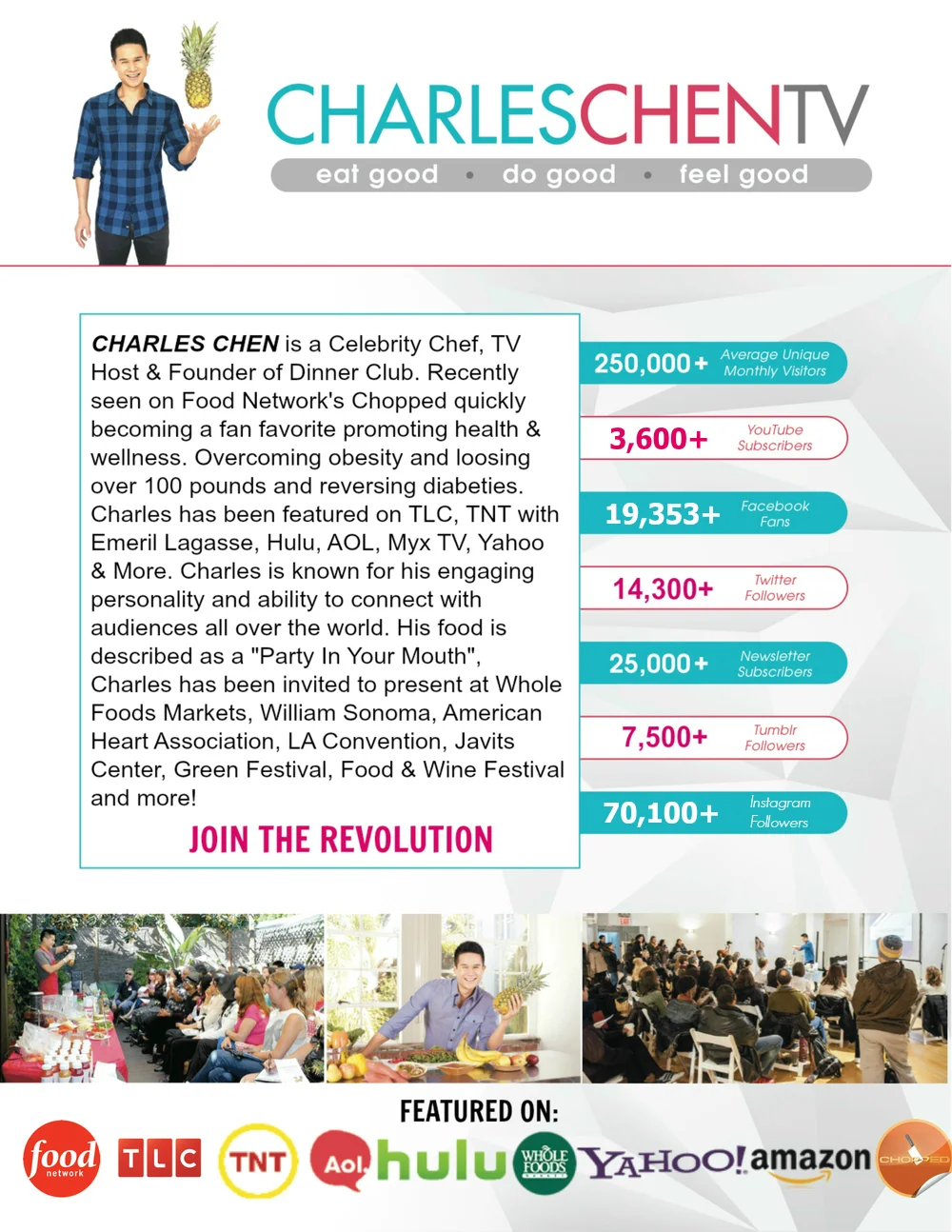 Work exclusively with Charles for a month as a brand ambassador for your company! 5 Events Incorporating your company , 1 Exclusive Sponsored Video, 3 Facebook Post, 3 Tweets, 3 Pinterest, 1 Instagram Post 3 Recipe Blog Posts, For likeness and image rights used in print, web media , represent brand on TV Media apperances booked from company's PR team, advertising on website, Speak on behalf of your company at up to 3 key events, including seminars and/or expos. Travel Costs Excluded.